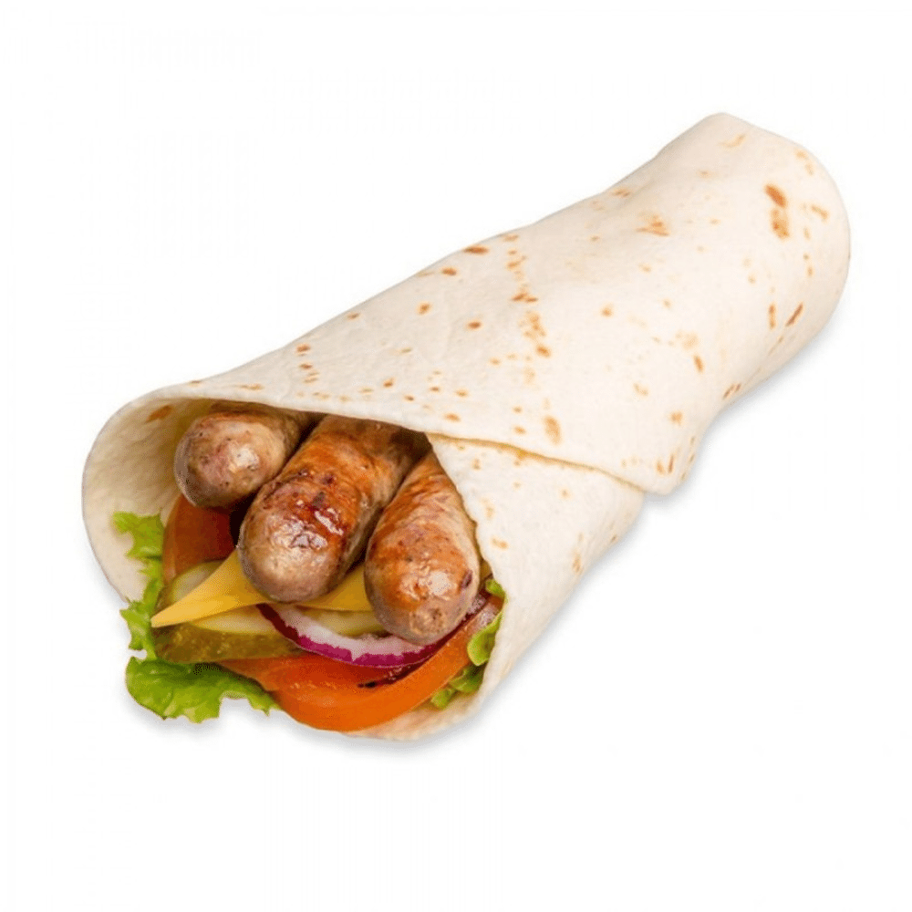Соус фирменный, колбаски баварские, лук, куриное филе, томат, огурец малосольный, капуста, горчичный соус